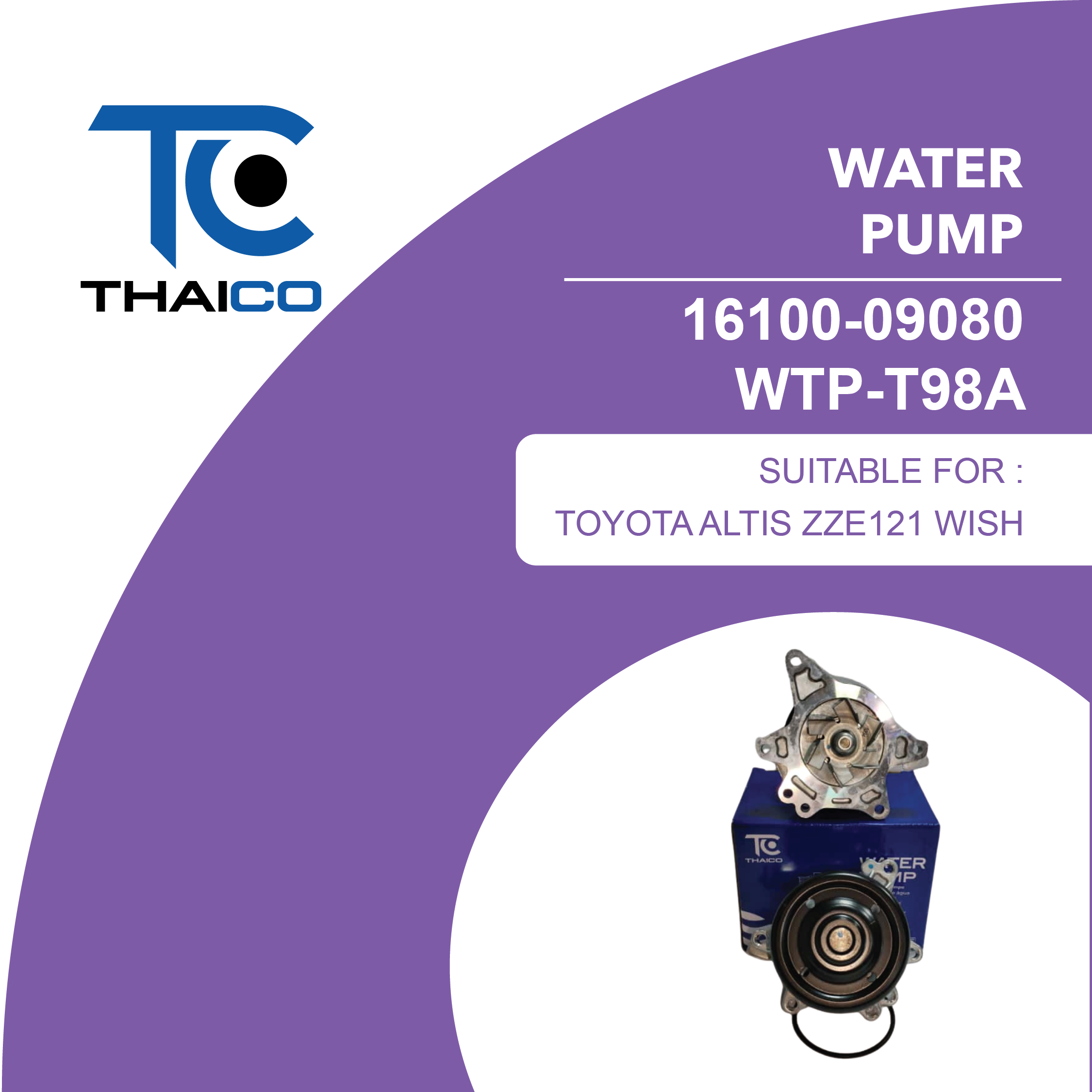 The 16100‑09080 (WTP‑T98A) is a mechanical engine water pump designed to circulate coolant through the engine block and radiator in certain Toyota 1ZZ‑FE / 3ZZ‑FE / 1.8 L/1.6 L petrol engines. It helps maintain correct operating temperature and prevent engine overheating. This specific pump is listed as an OEM‑equivalent direct replacement for Toyota service part 16100‑09080.