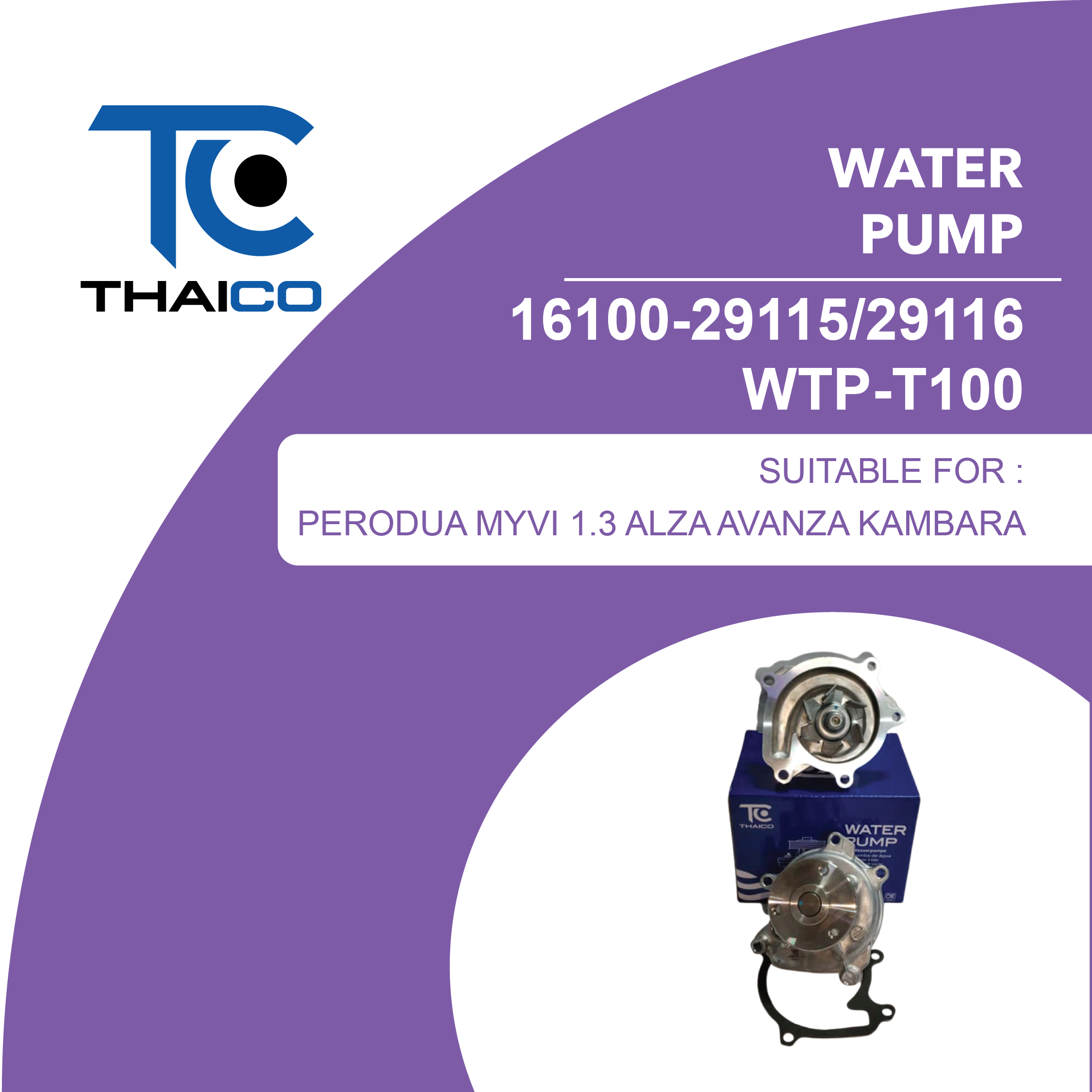 The 16100-29115 / 16100-29116 (WTP-T100) is a mechanical engine water pump designed to circulate coolant through the engine block and radiator, keeping operating temperature within the correct range and helping to prevent overheating. Built to OEM-equivalent standards, it serves as a direct replacement for the original Toyota pump assembly on compatible models (always confirm by engine and model before installation).