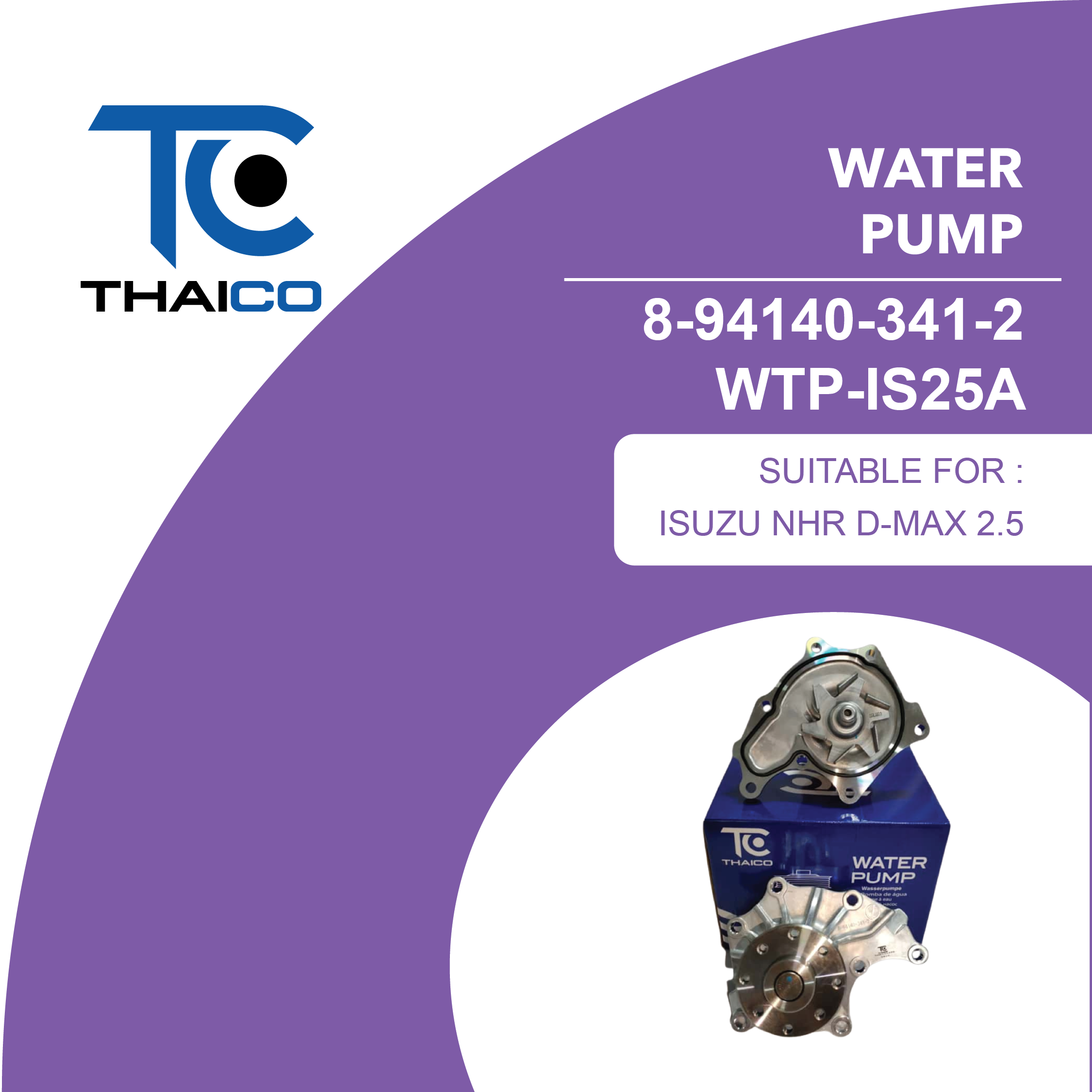 The 8-94140-341-2 (WTP-IS25A) is a mechanical engine water pump designed to circulate coolant through the engine block and radiator, maintaining proper operating temperature and helping prevent overheating. Built to OEM-equivalent standards, it serves as a direct replacement for the original water pump on compatible Isuzu engines/applications (confirm by engine and model before installation).